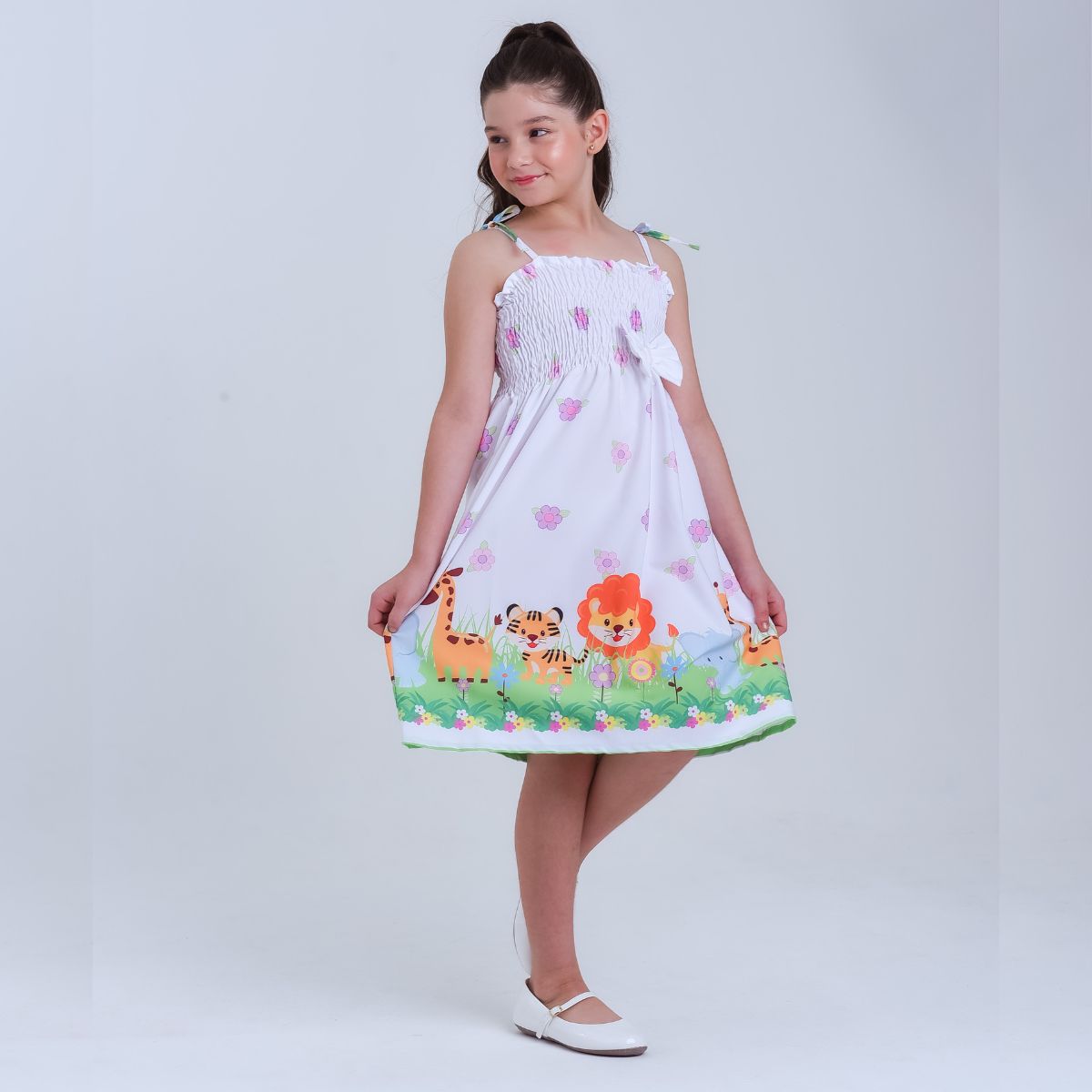 Vestido infantil estampa do Safari modelo ciganinha com o leãozinho, tigre, Girafa e o elefante